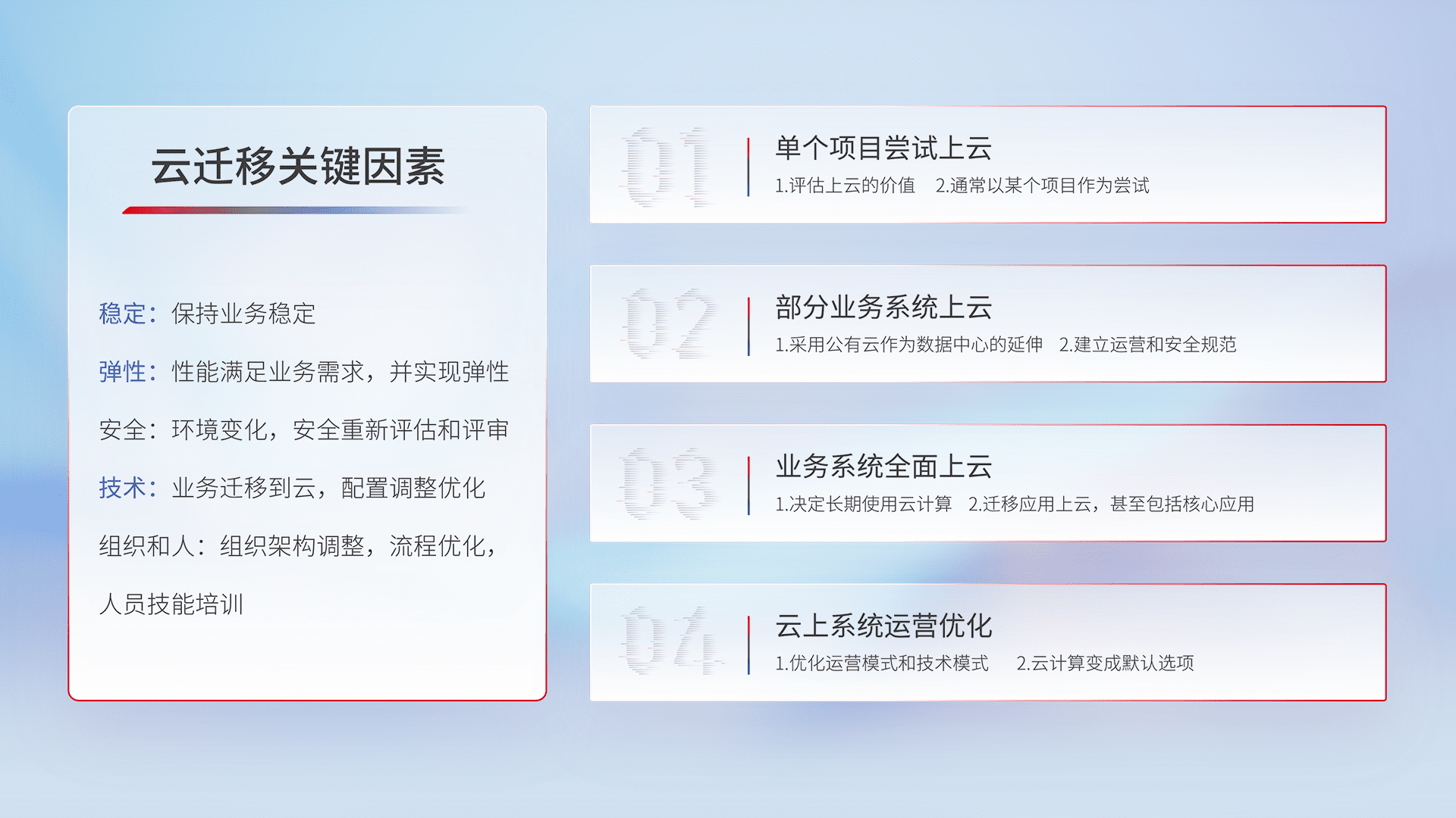 结合实际业务,,从规划设计、、、云平台选型、、云原生改造、、、数据迁移、、、集成交付,,,迁移全过程为客户识别最佳上云路径,,做好风险识别管理,,,设计网络架构、、身份权限、、、安全审计合规、、操作审计、、日志审计、、、、监控告警策略、、、、多站点容灾设计等,,,对云上基础设施进行整体规划,,,,提升IT治理水平,,,,以满足弹性、、、高可用、、高性能的需求。。。
