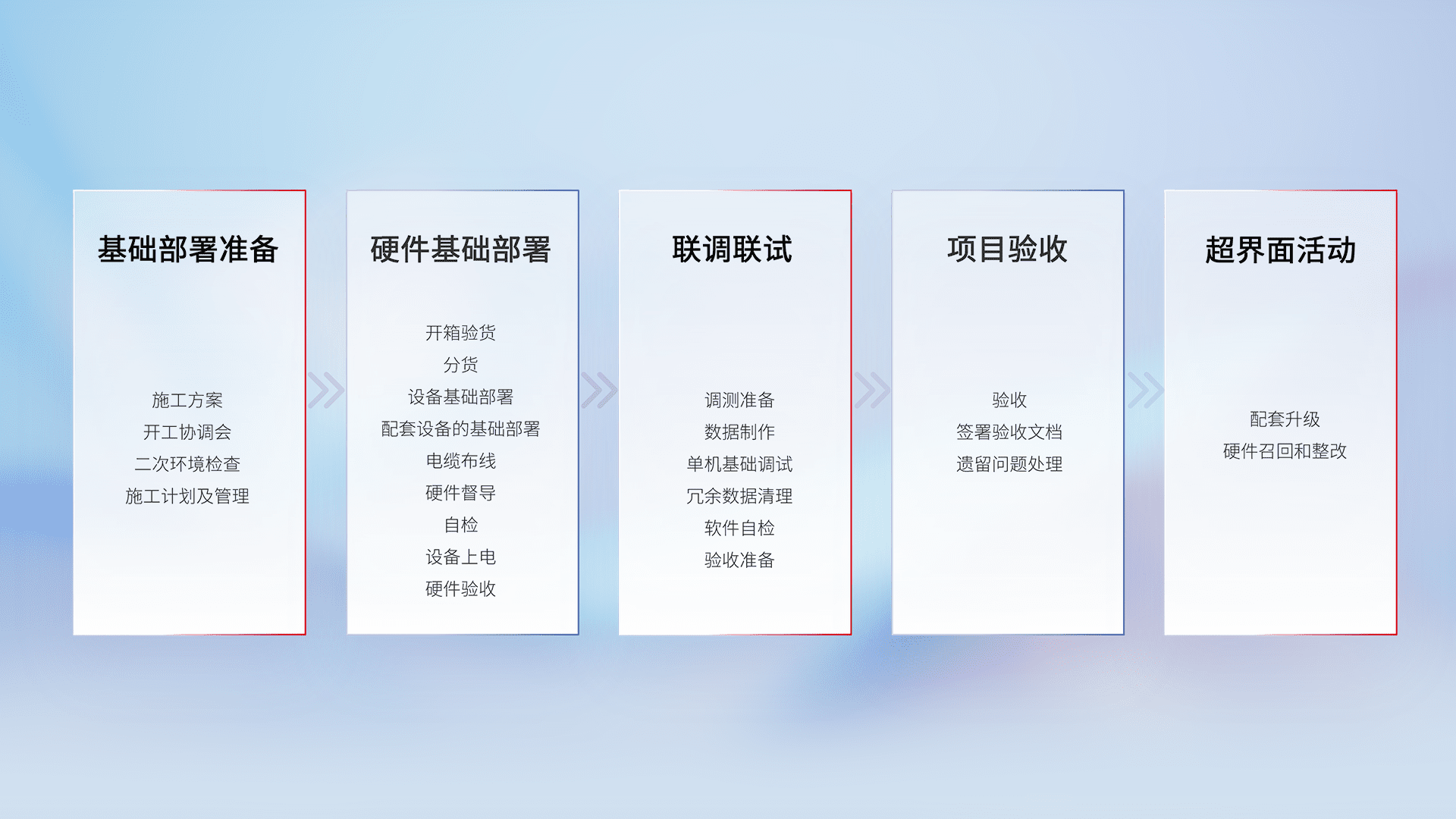 从基础部署准备、、硬件基础部署、、、联调联试、、、、项目验收、、越界面活动的全过程可追溯,,,保证施工质量和进度。。。
